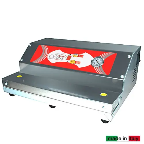 Sottovuoto ad aspirazione esterna, struttura in Acciaio Inox. Elettrovalvola di fine ciclo e ferma sacchetto. Comandi digitali. Pompa autolubrifi- cante. Alimentazione 230V.