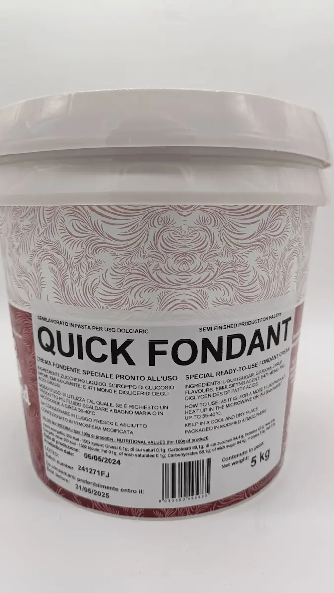 Crema di zucchero fondente pronta all’uso per decorazioni, glassature e preparazioni di crema al burro. Grazie alla sua formulazione il prodotto garantisce una glassatura stabile e brillante per lungo tempo anche a basse temperature ( -18/-20°C). Volendo una consistenza più fluida , Quick Fonda...