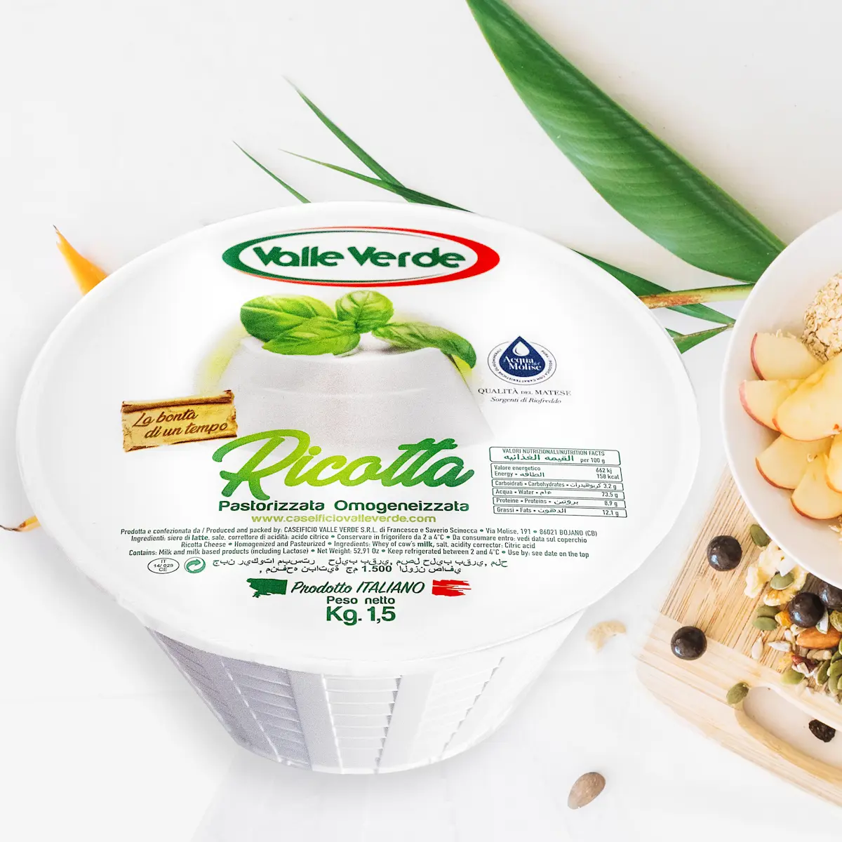 La Ricotta pastorizzata Valle Verde è un prodotto fresco, molle e cremoso, ottenuto dal siero di latte vaccino con l’aggiunta di crema di latte e sale.