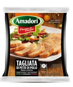 Tagliata di petto di pollo cotta. Prodotto surgelato. Shelf life: 540 giorni dalla data di produzione.